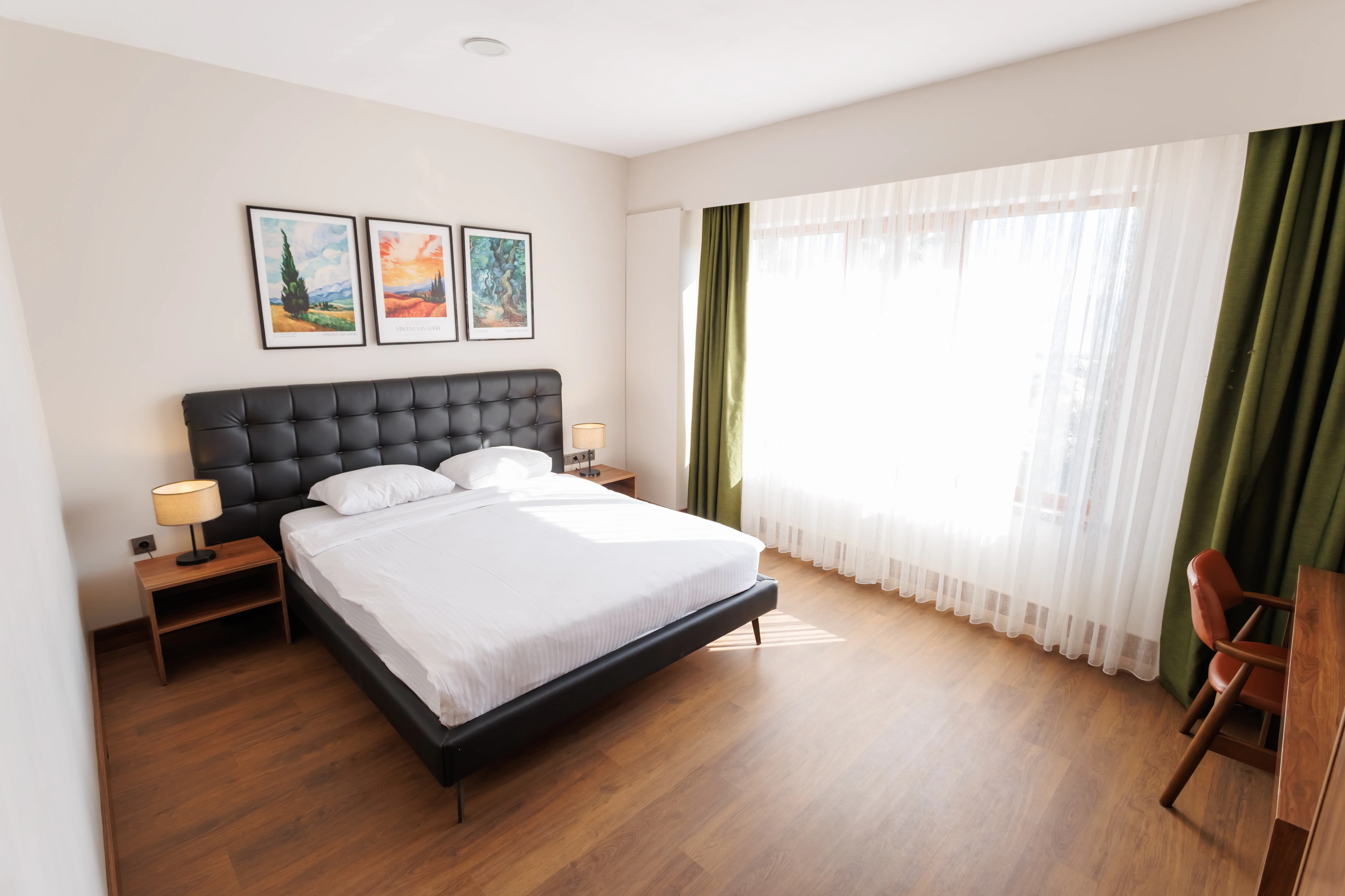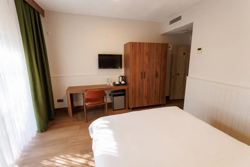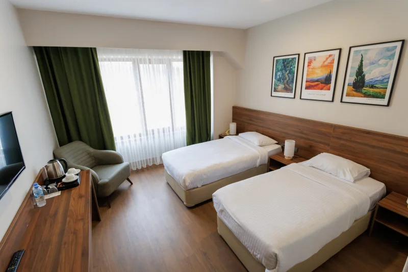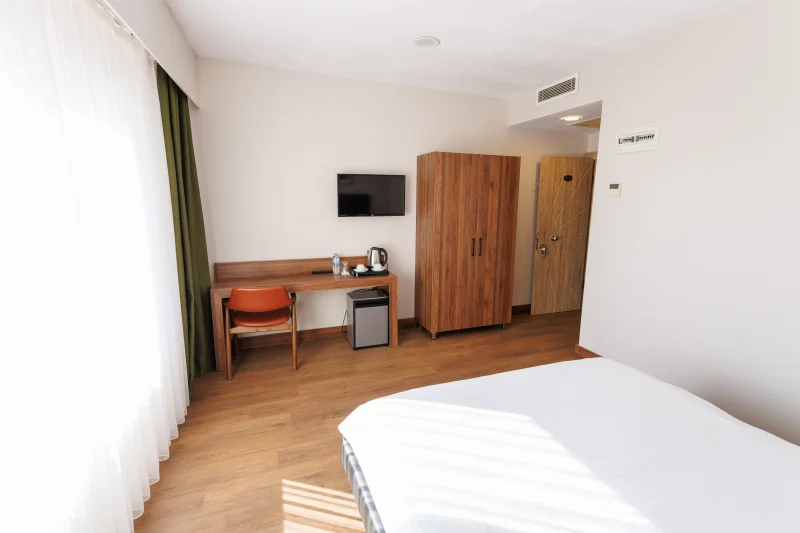 Konaklamanız boyunca odalarımızdaki modern olanaklar sizi bekliyor: Wi-Fi, TV, çalışma masası, gardırop, klima, saç kurutma makinesi, elektrikli su ısıtıcı ve çay-kahve seti ile konforunuzu ön planda tutuyoruz. 26 m² genişliğindeki odalarımız, konforlu ve temiz bir ortamda, size evinizin rahatlığını sunuyor.